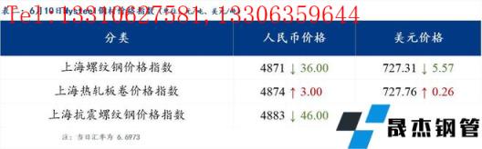 6月10日普鋼絕對價格指數(shù)變化:綜合指數(shù)5058.29,下跌12.4;螺紋鋼指數(shù)4821.36,下跌17.99;線材指數(shù)5213.65,下跌16.88;熱軋板卷指數(shù)4877.7,下跌9.63;冷軋板卷指數(shù)5337.5,下跌9.3;中厚板指數(shù)5076.26,下跌7.47。