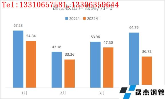 2022年4月我國鍍層板(帶)出口總量共計95.29萬噸,月環比降幅17.33%,年同比降幅38.50%;2022年1-4月份我國鍍層板(帶)出口總量共計399.99萬噸,年同比降幅18.02%。