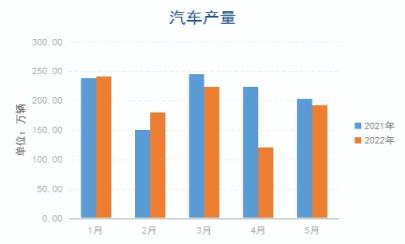 據中國汽車工業協會統計數據顯示,2022年5月份,汽車產銷分別完成192.6萬輛和186.2萬輛,環比分別增長59.7%和57.6%,同比分別下降5.7%和12.6%。1-5月,汽車產銷分別完成961.8萬輛和955.5萬輛,同比分別下降9.6%和12.2%。