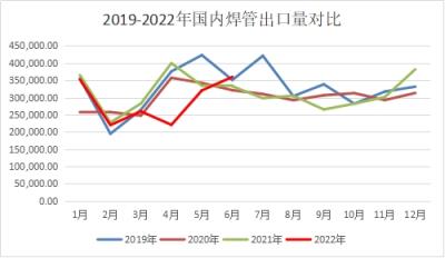 據(jù)海關最新統(tǒng)計顯示,2022年6月我國出口焊管35.96萬噸,環(huán)比增長12.18%;進口焊管1.11萬噸,環(huán)比增長5.97%;凈出口焊管34.85萬噸,較上月增長11.02%。1-6月凈出口量172.12萬噸,同比下降5.64%,處于三年均值以下水平,6月出口量在國內(nèi)焊管產(chǎn)量的占比回升至6.82%。