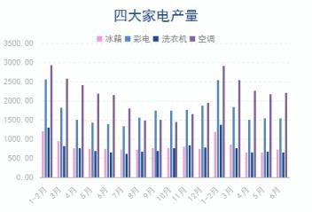 1-6月份,冰箱產(chǎn)量4164.2萬臺(tái),同比下降6.2%;彩電產(chǎn)量8986.4萬臺(tái),同比增長5.8%;洗衣機(jī)產(chǎn)量4113.3萬臺(tái),同比下降4.1%;空調(diào)產(chǎn)量12248.9萬臺(tái),同比增長1.1%。